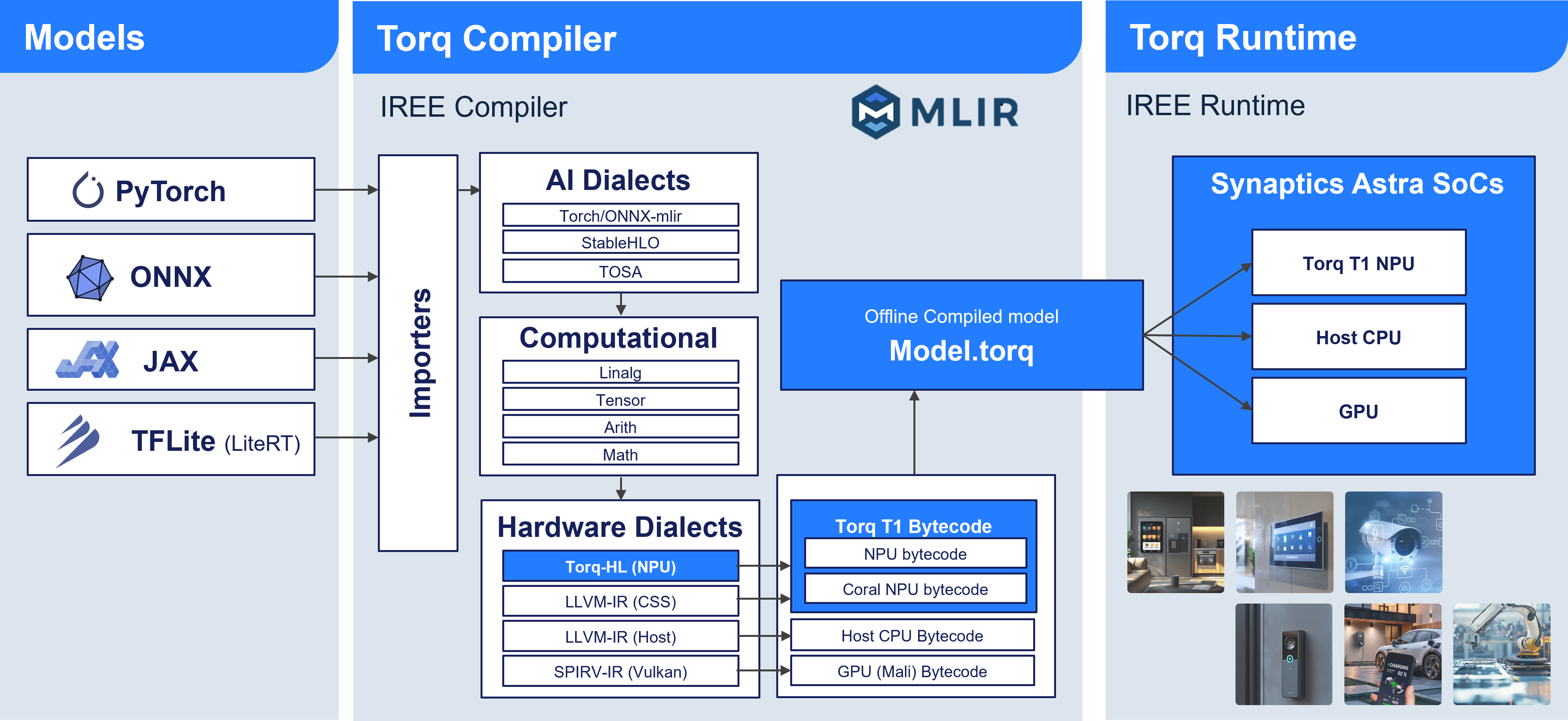 Torq combines core elements of NPU hardware and associated software to set a new standard in IoT application development. Delivered as part of Synaptics’ Astra™ line of AI-Native processors, the Torq line of NPUs is the result of close collaboration with Google Research and integrates their open-source Coral NPU. The software components include the Torq-compiler and the Torq-runtime, based on the open-source IREE/MLIR end-to-end compiler framework.